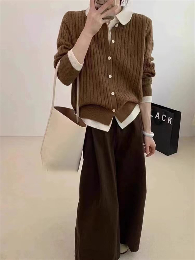襟付きで知的な印象を与え、ケーブル編みが程よいアクセントに。