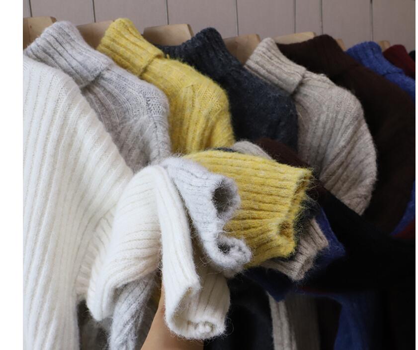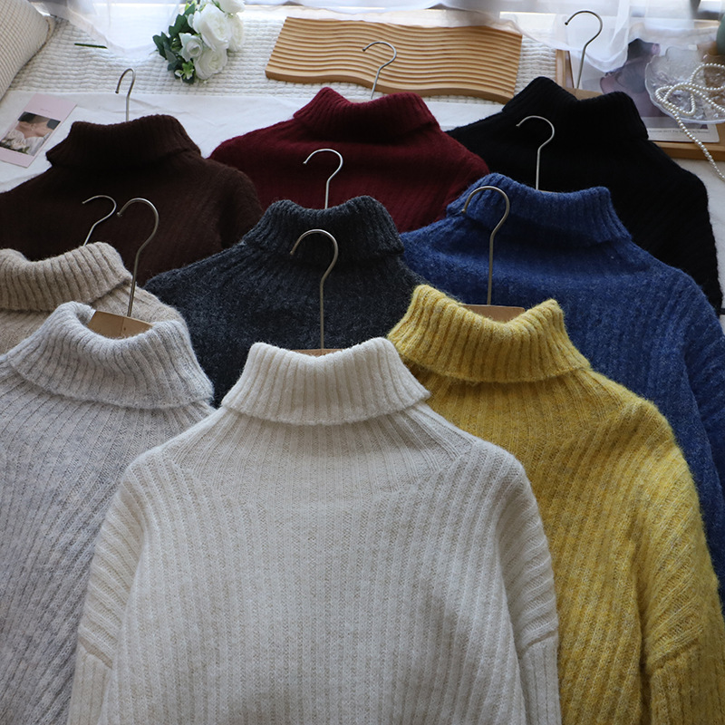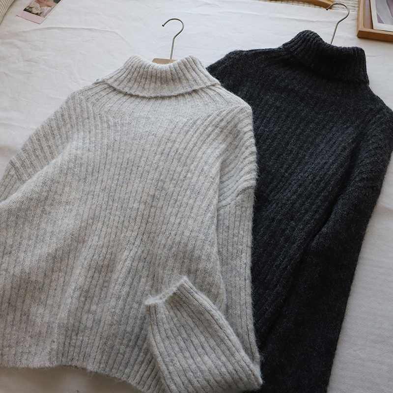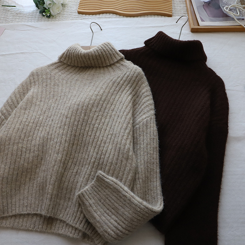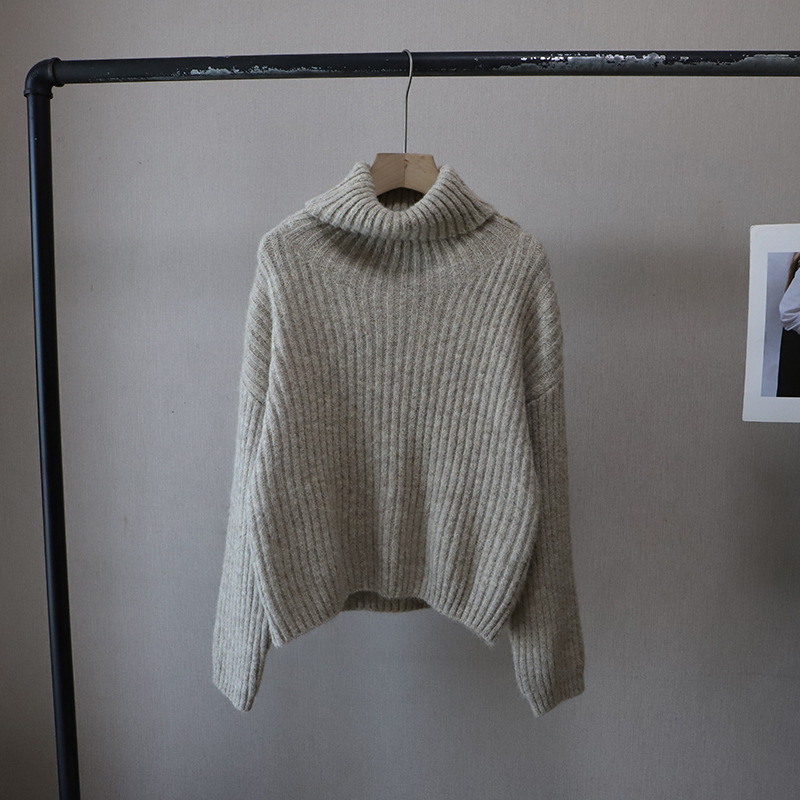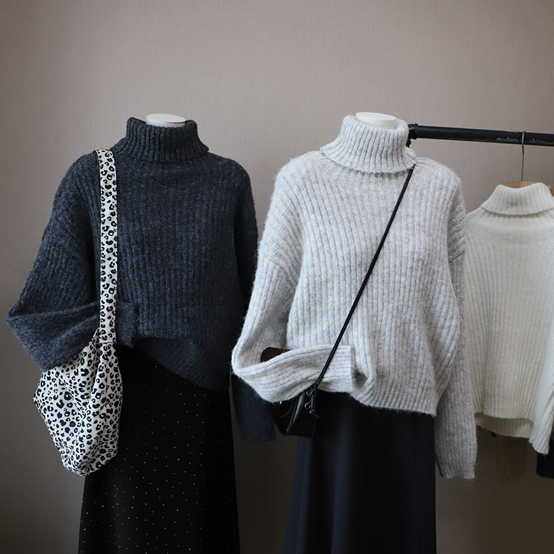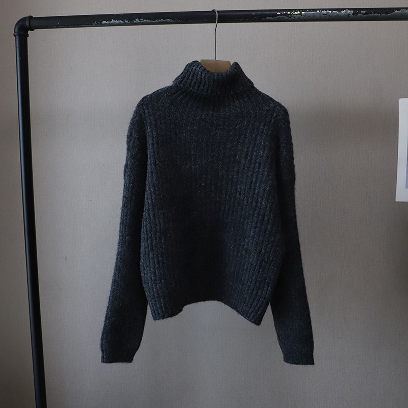 50代ファッションにぴったりの洗練されたハイネックニットセーター。
