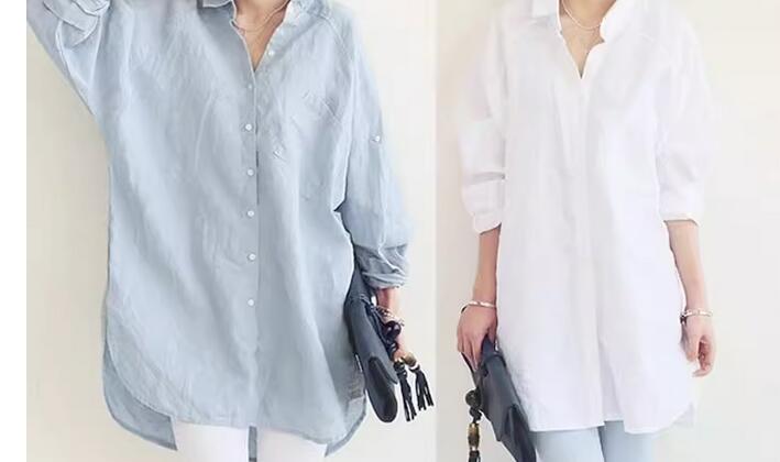 ゆったりとしたシルエットで体型カバー効果があり、白と淡いブルーの2色をご用意。