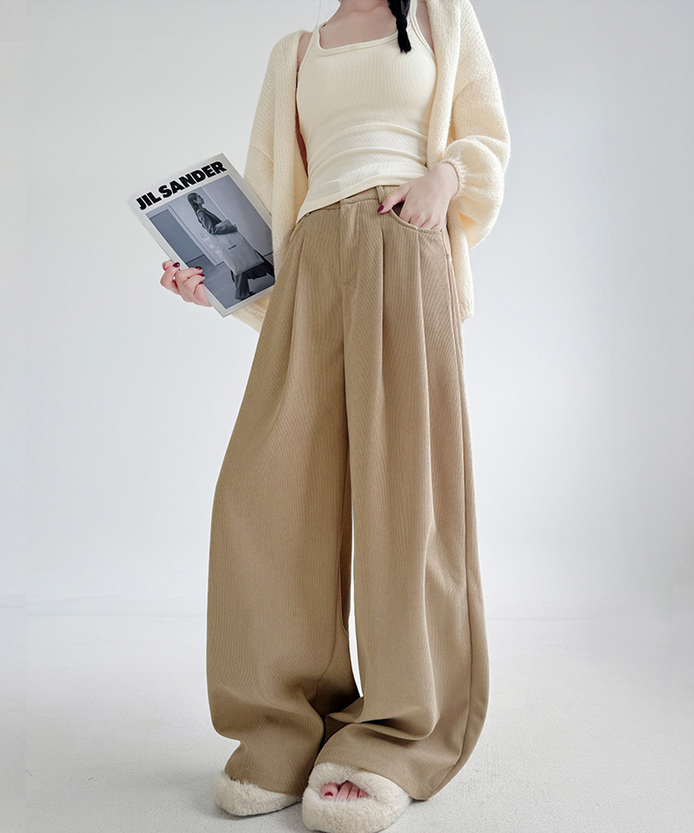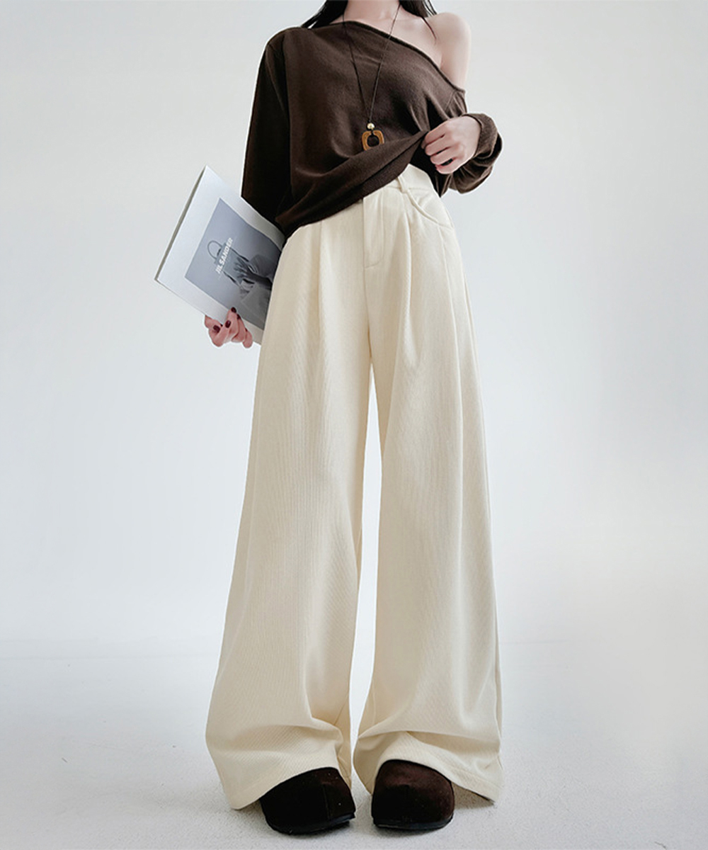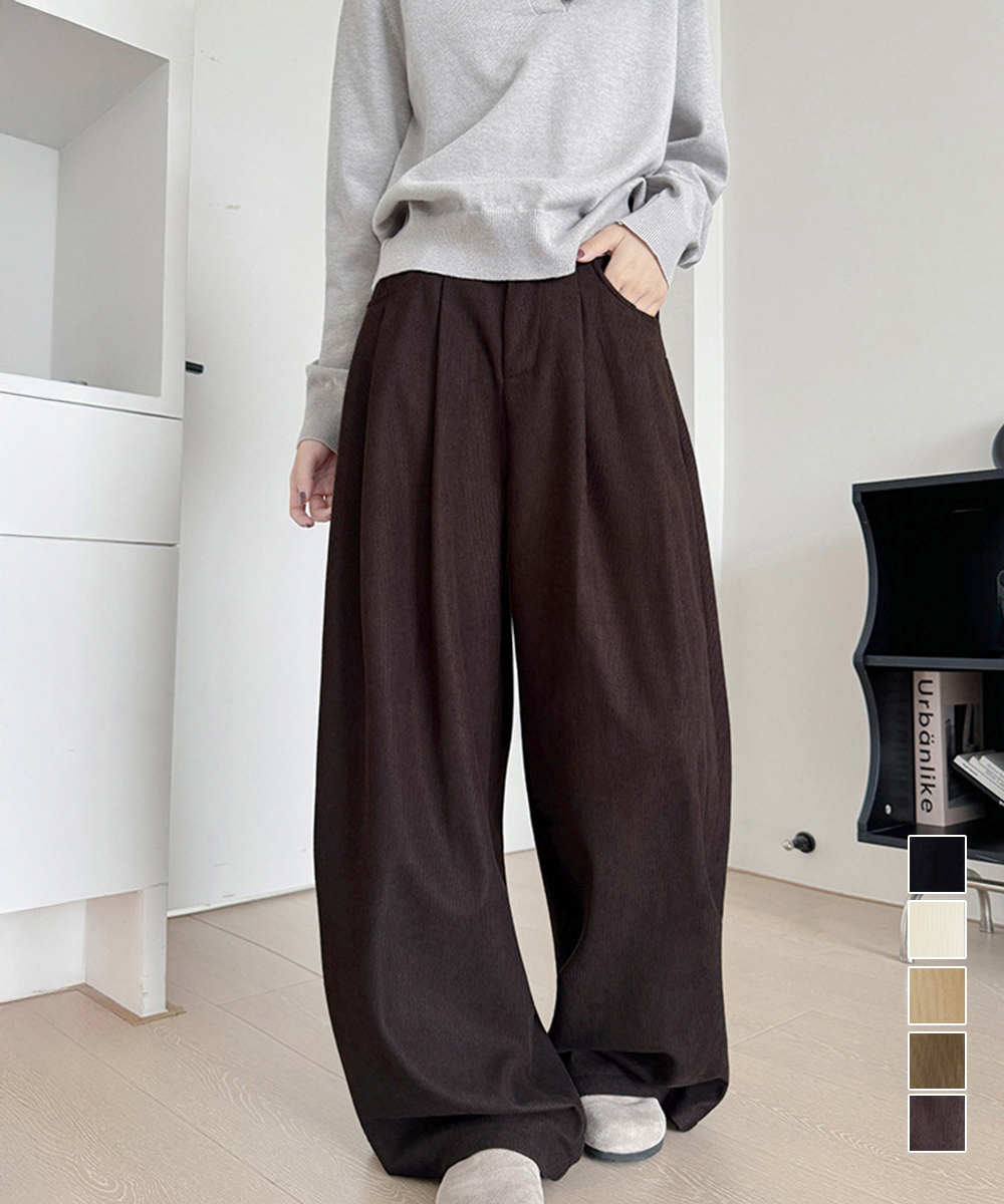 50代ファッションに最適な落ち感のある高品質コーデュロイ素材で仕上げたワイドパンツ。