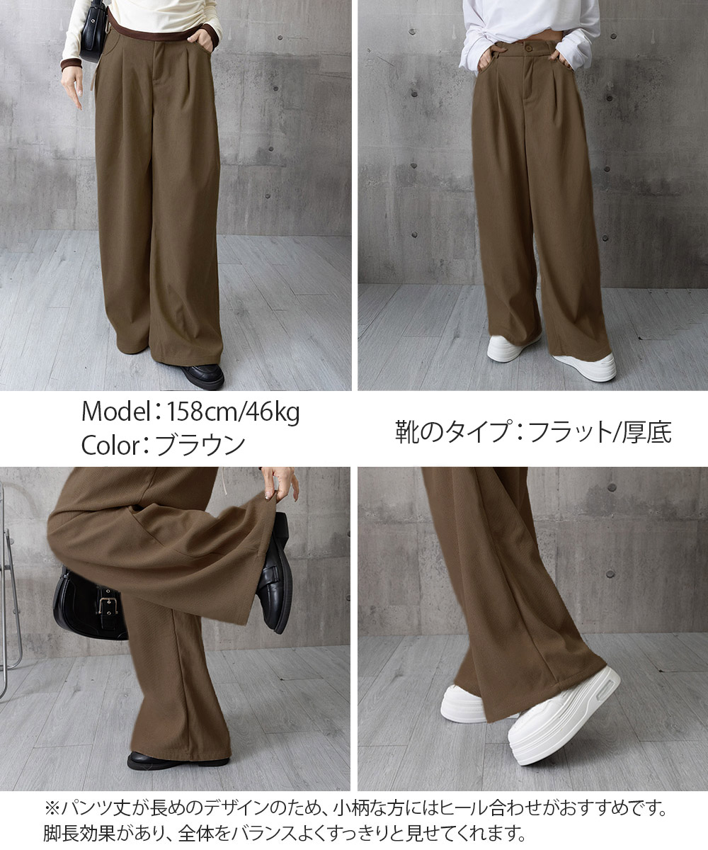 ハイウエスト設計で体型カバーと脚長効果を実現し、ゆったりとしたシルエットが上品な大人の着こなしを演出。