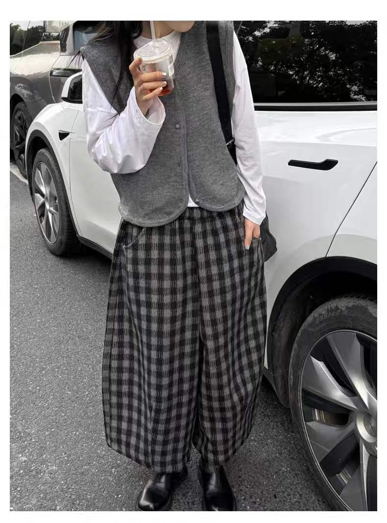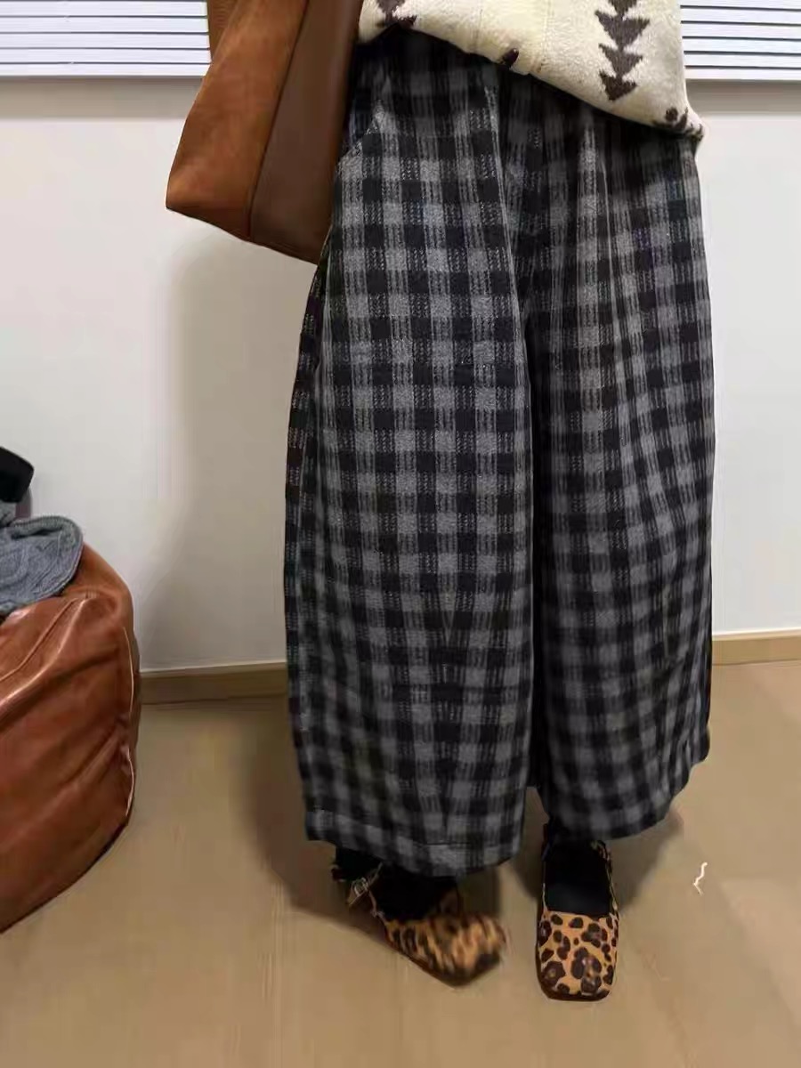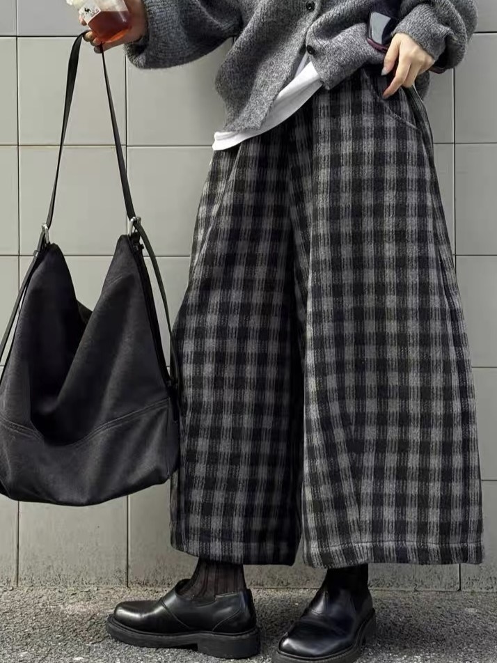 50代ファッションにぴったりの上質なチェック柄ワイドパンツです。