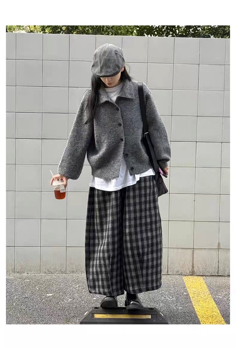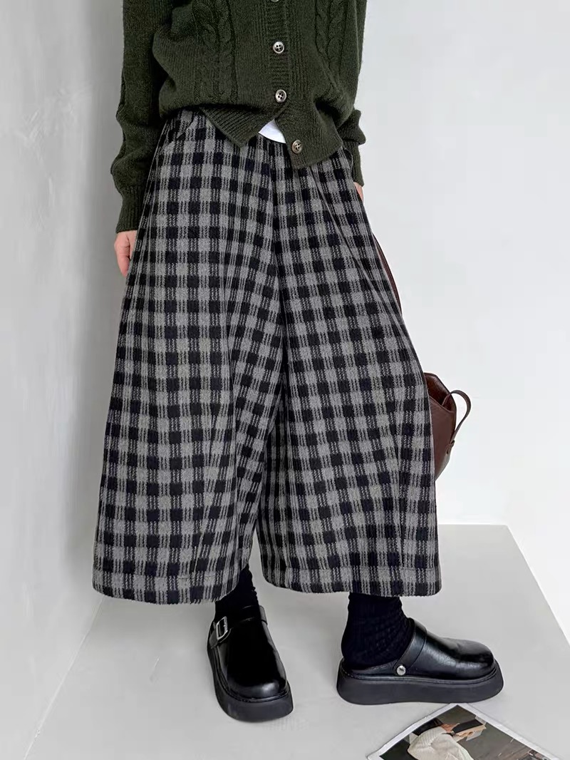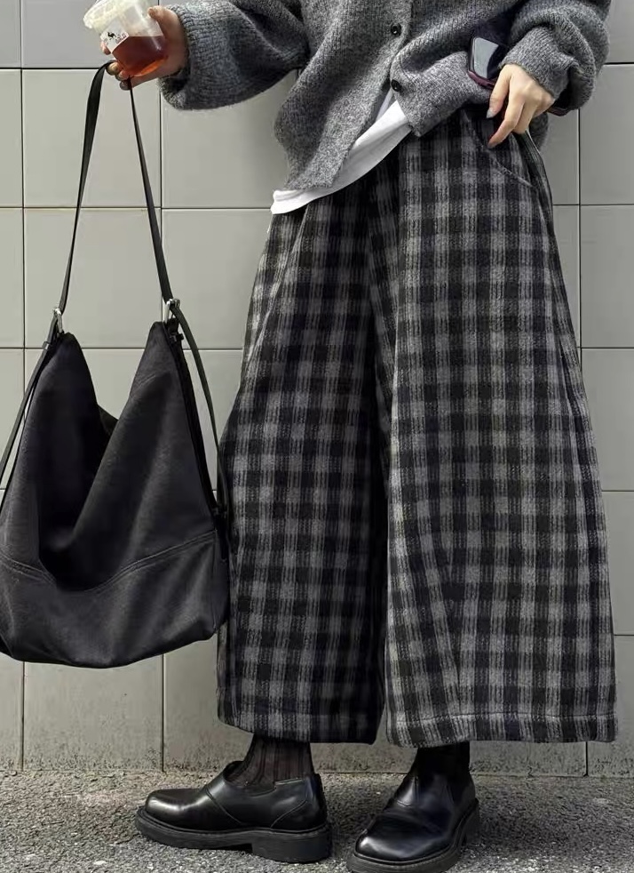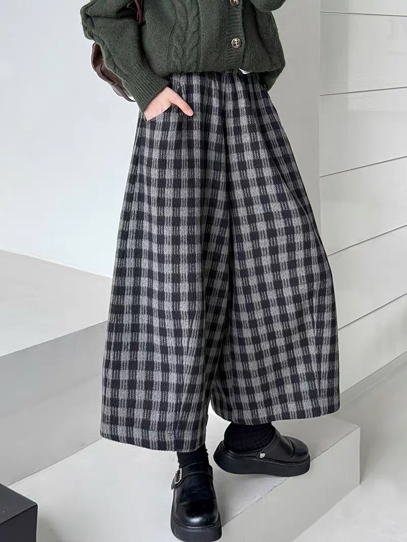 落ち着いた色合いのチェック柄で、様々なトップスと合わせやすい万能アイテムです。