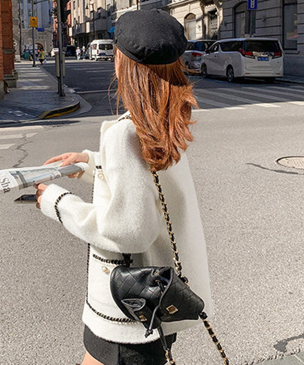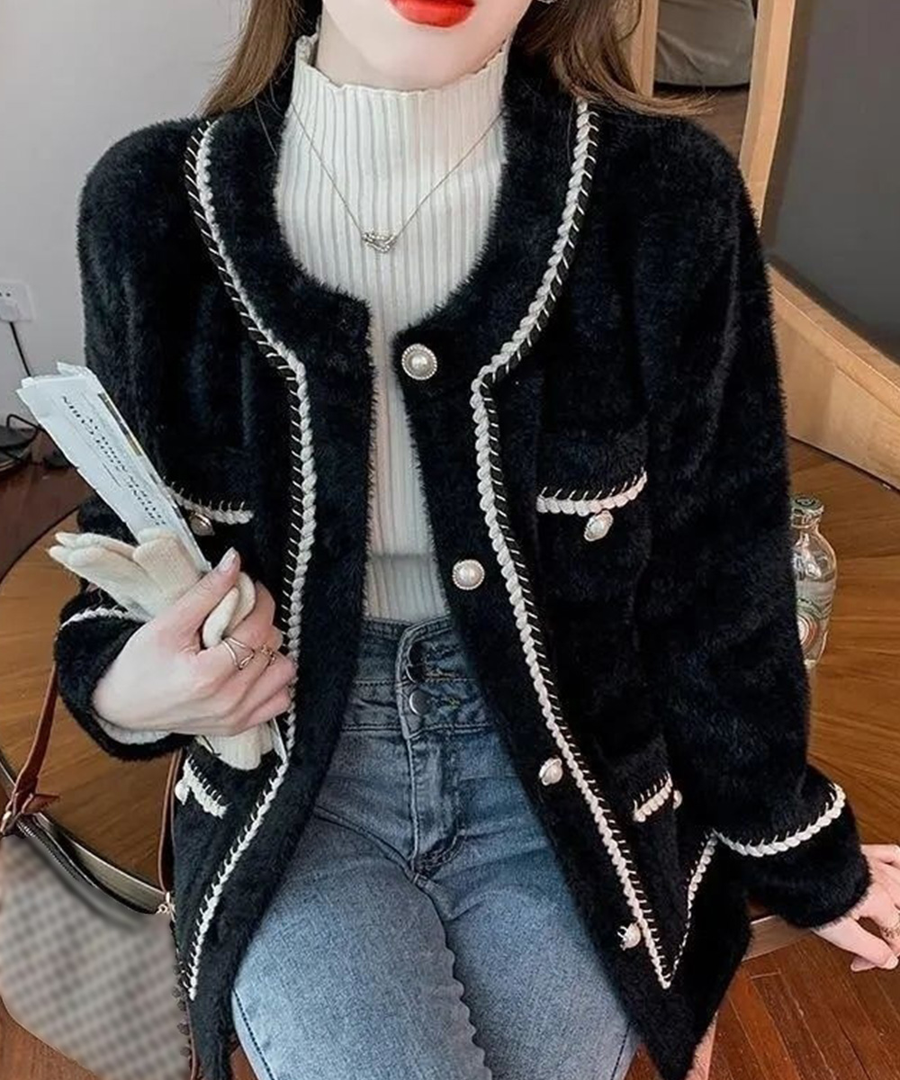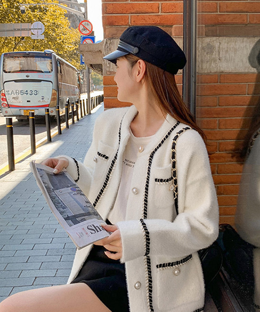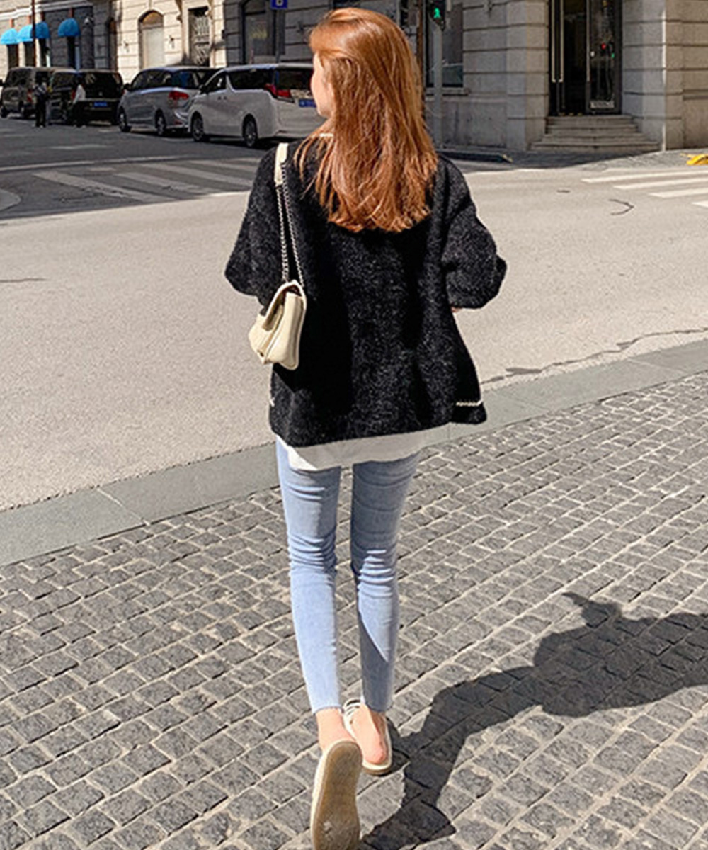 50代ファッションにぴったりの上質なモヘア風ニットカーディガン。