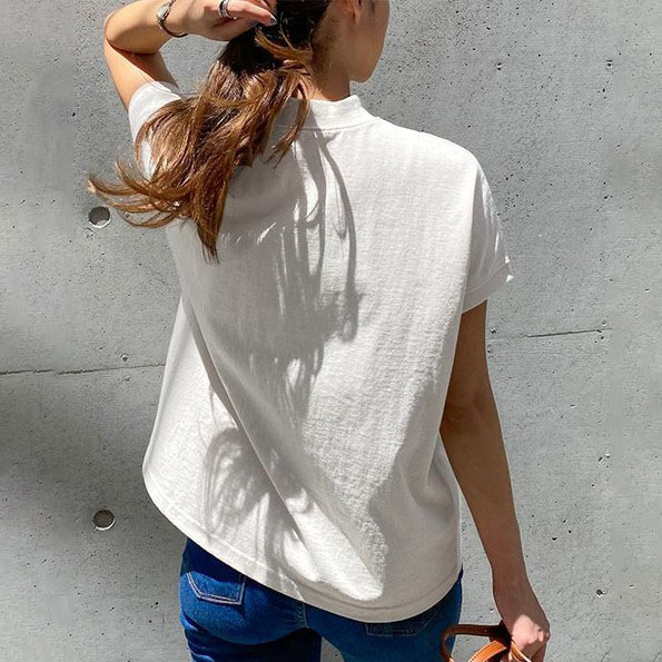無地のシンプルなデザインで着回し抜群、春夏のワードローブに欠かせない一枚です。